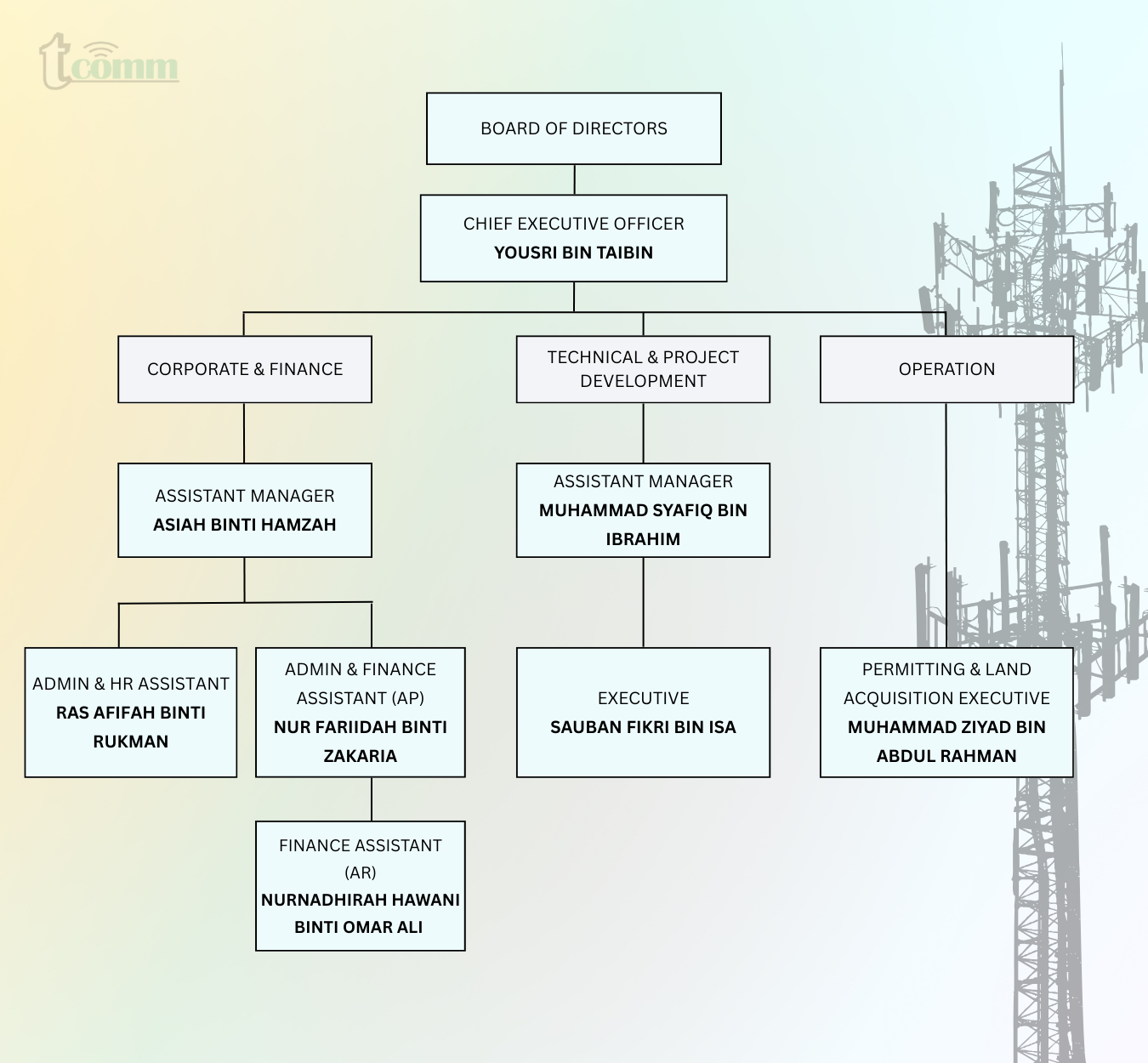 TERENGGANU TELECOMMUNICATIONS SDN BHD (TCOMM) is a One Stop Agency (OSA) for the state of Terengganu, appointed by Mentri Besar, Trengganu to monitor and coordinate the development of telecommunications infrastructure in Terengganu, inline with the regulations of State Local Authorities (PBT). Part of our role is also to advise and feed the state of Terengganu in infrastructures and digitalisation objectives adhering to state policy on information technology.